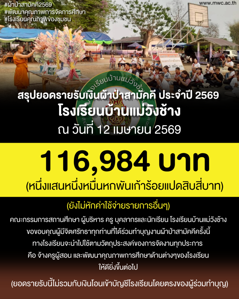 โรงเรียนบ้านแม่วังช้างขอเชิญศิษย์เก่า ศิษย์ปัจจุบัน และประชาชนทุกท่านร่วมงานผ้าป่าสามัคคี ประจำปี 2569